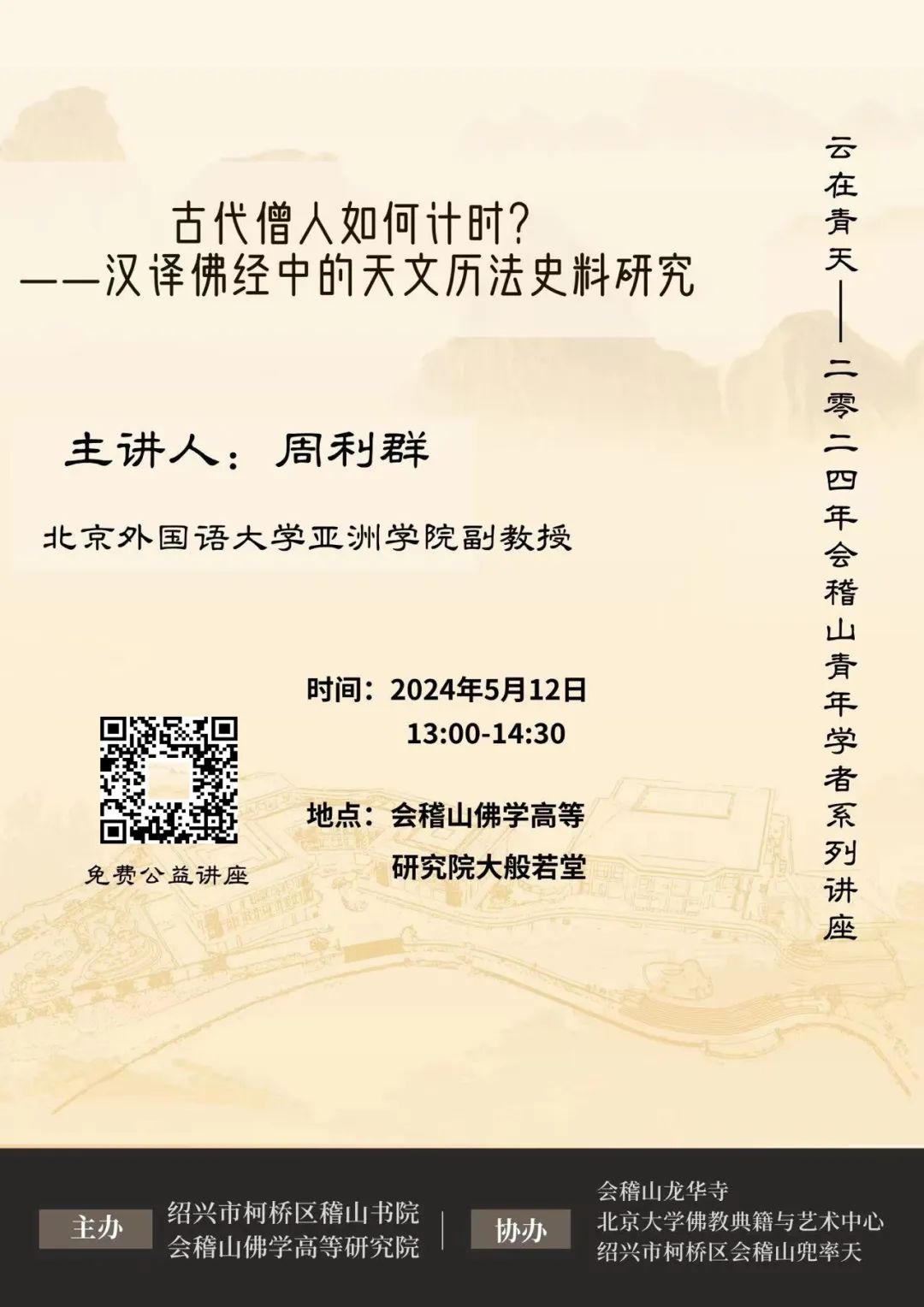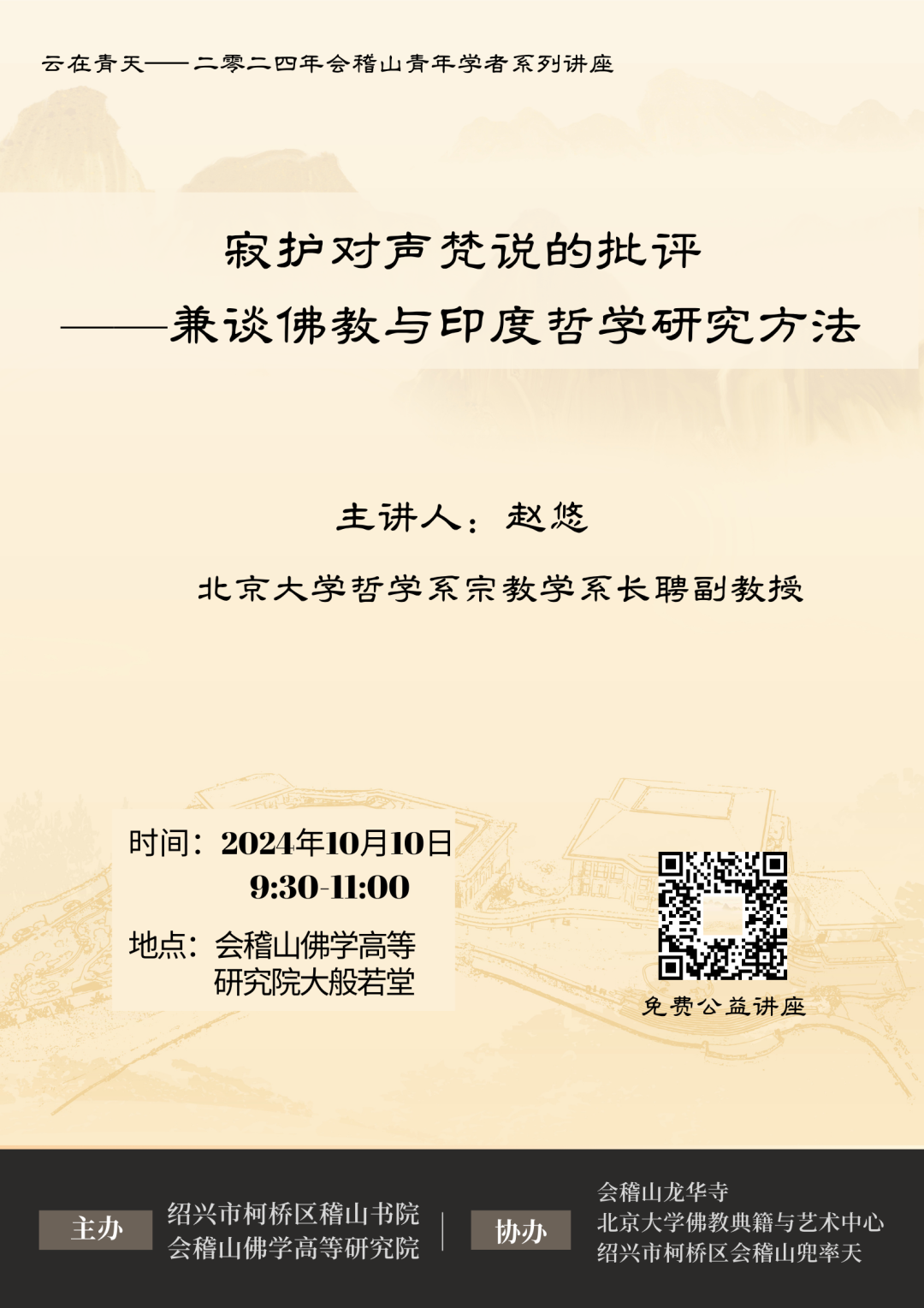 稽山书院,肇自北宋范仲淹,千载人文悠悠相续,复院后坐落于绍兴市柯桥区,下设会稽山佛学高等研究院、博士后工作站等研究机构。本院以弘扬中国优秀传统文化为己任,以国际交流为特色,与国内外众多著名高校紧密互动,力求打造绍兴文化高地。为回报社会,利益众生,特延请众多高校著名学者开设“云在青天——二零二四年会稽山青年学者系列讲座”,该讲座为免费公益学术活动,敬请关注。